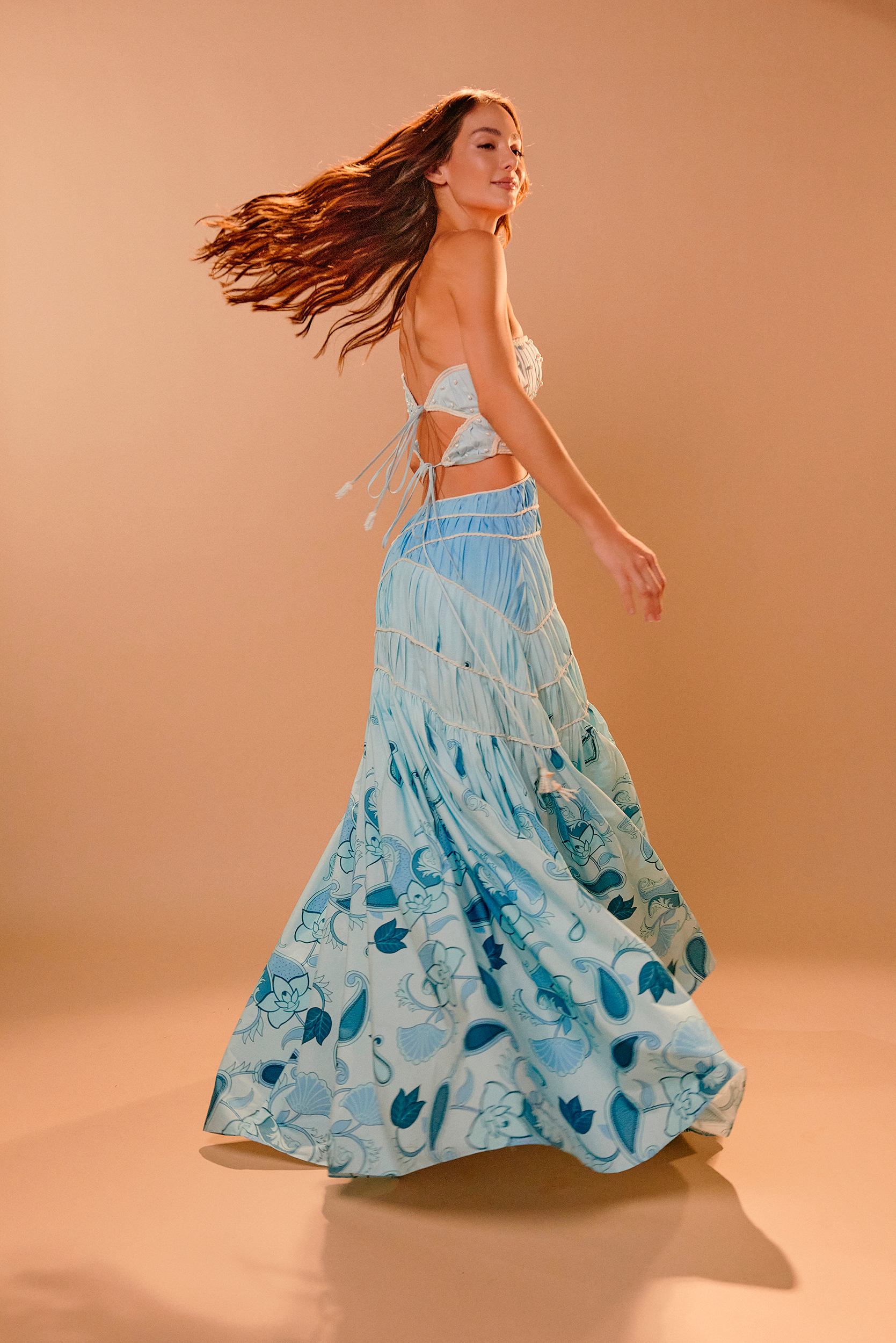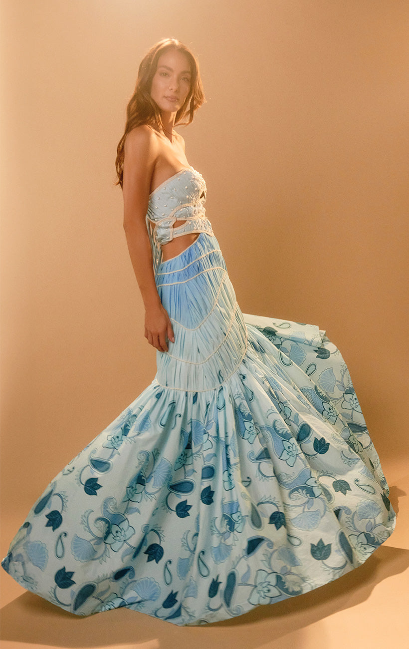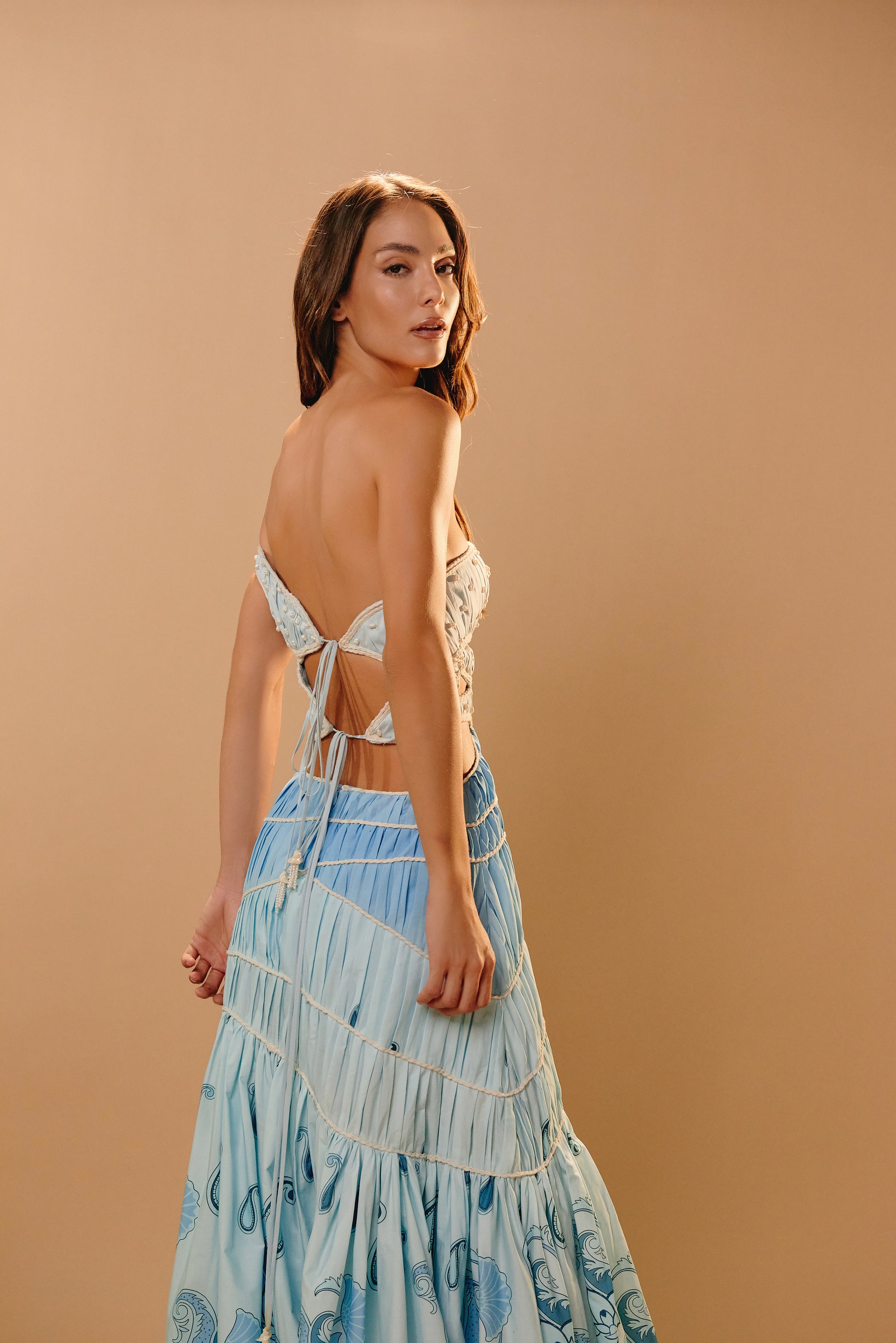 Nuestro vestido largo de la colección Sunny PV24. Su silueta sirena y sus detalles drapeados crean un look cautivador. La tela está estampada con un impresionante degradado de tonos azules que evoca la profundidad del océano. El busto asimétrico y el top drapeado están bordados a mano con perlas, mientras que los cordones en la espalda ofrecen un ajuste a medida.