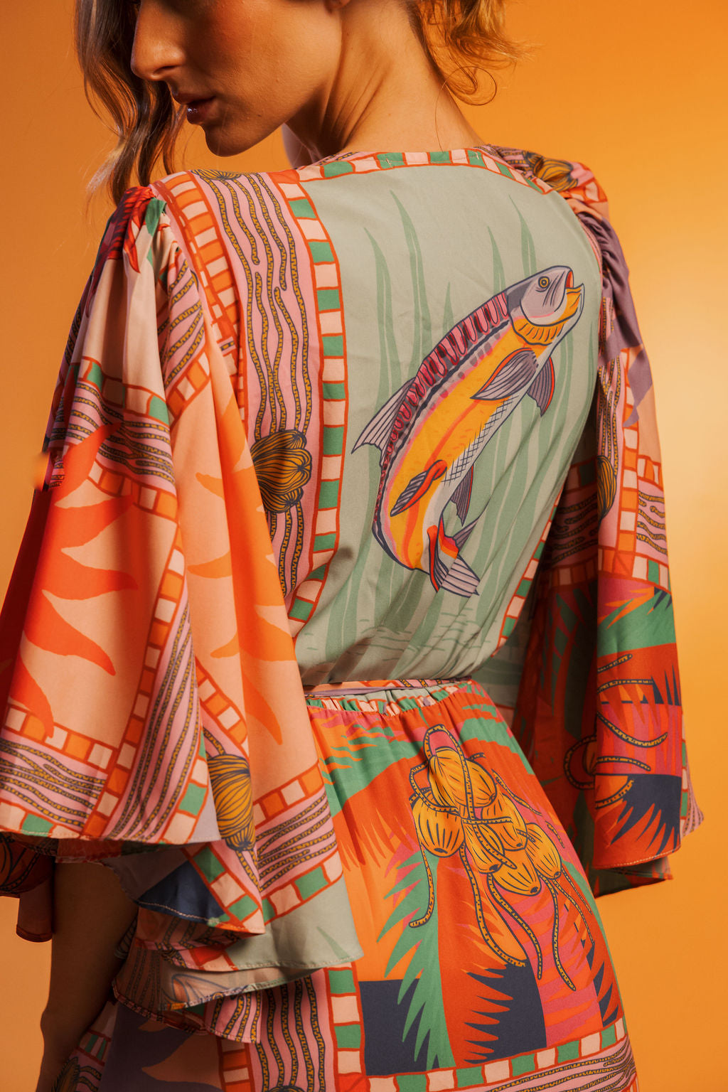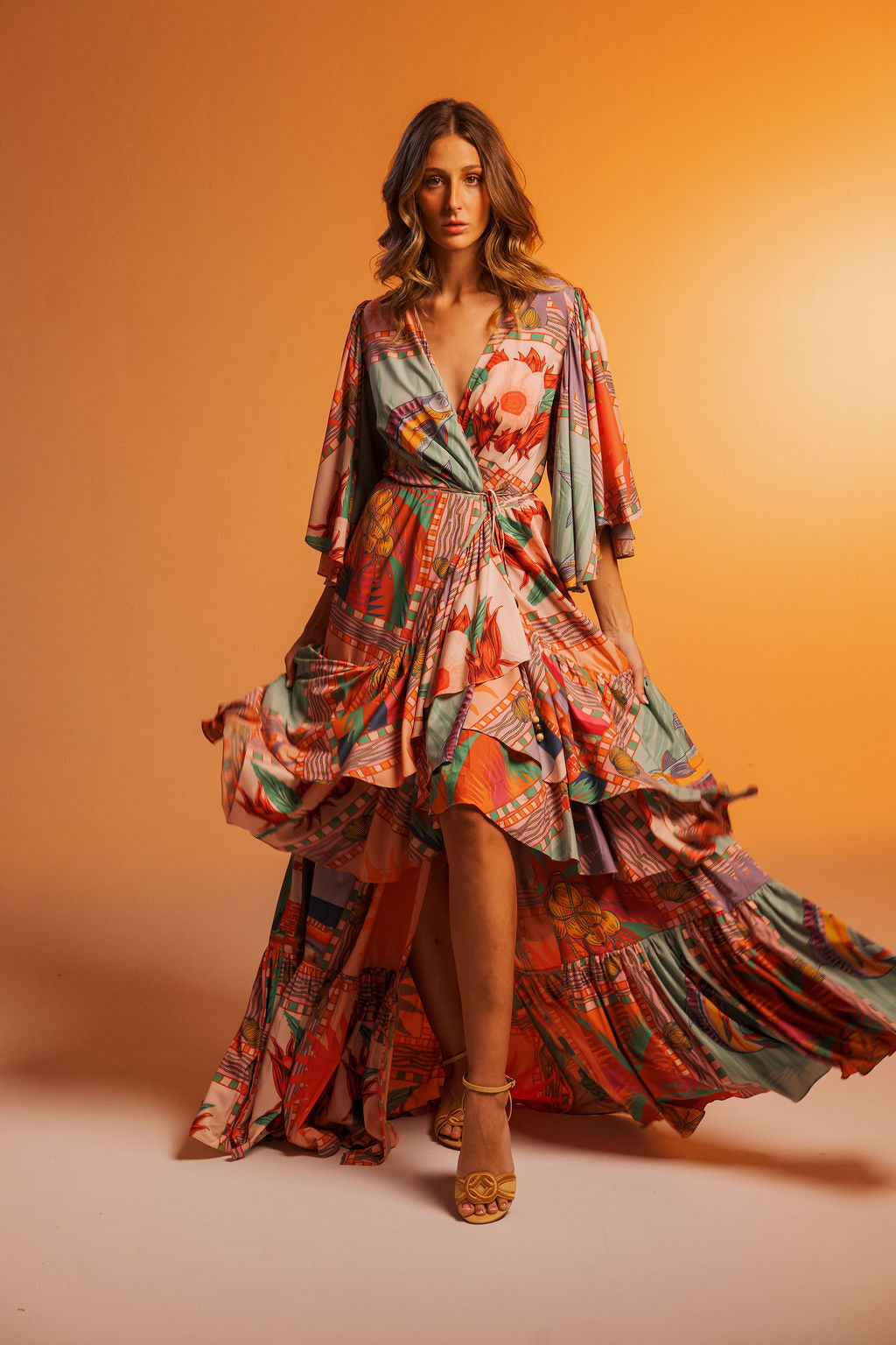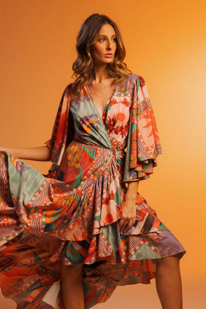 A majestic silhouette inspired by the richness of Portobelo. The Cimarrón Maxi Dress features a fluid high-low hemline, deep wrap neckline, and flared sleeves for an elegant, effortless look. Printed in our exclusive Portobelo print, an explosion of color and heritage