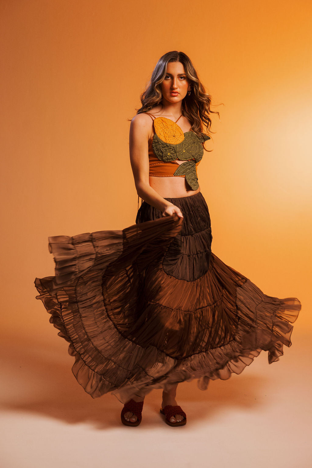 This flowing maxi skirt is crafted in layers of sheer chocolate-brown fabric with a pleated texture that adds graceful movement to every step. The ruffled hem and tiered silhouette create volume and lightness, perfect for tropical evenings or elegant getaways. Pair it with the Bon Crop Top for the complete look.
