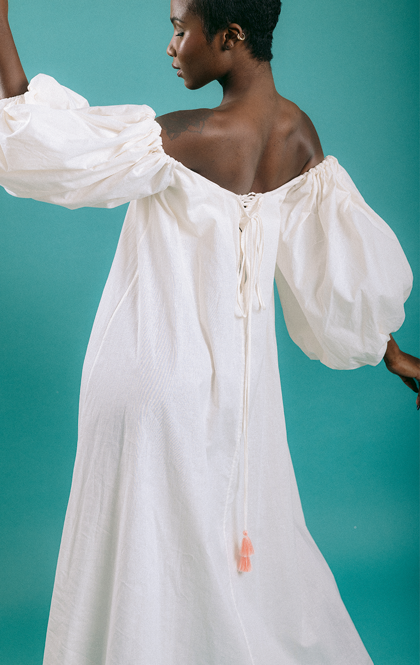 Vestido midi de lino liso con aplicaciones de flores bordadas a mano en la parte delantera, escote bandeja con mangas descubierto.