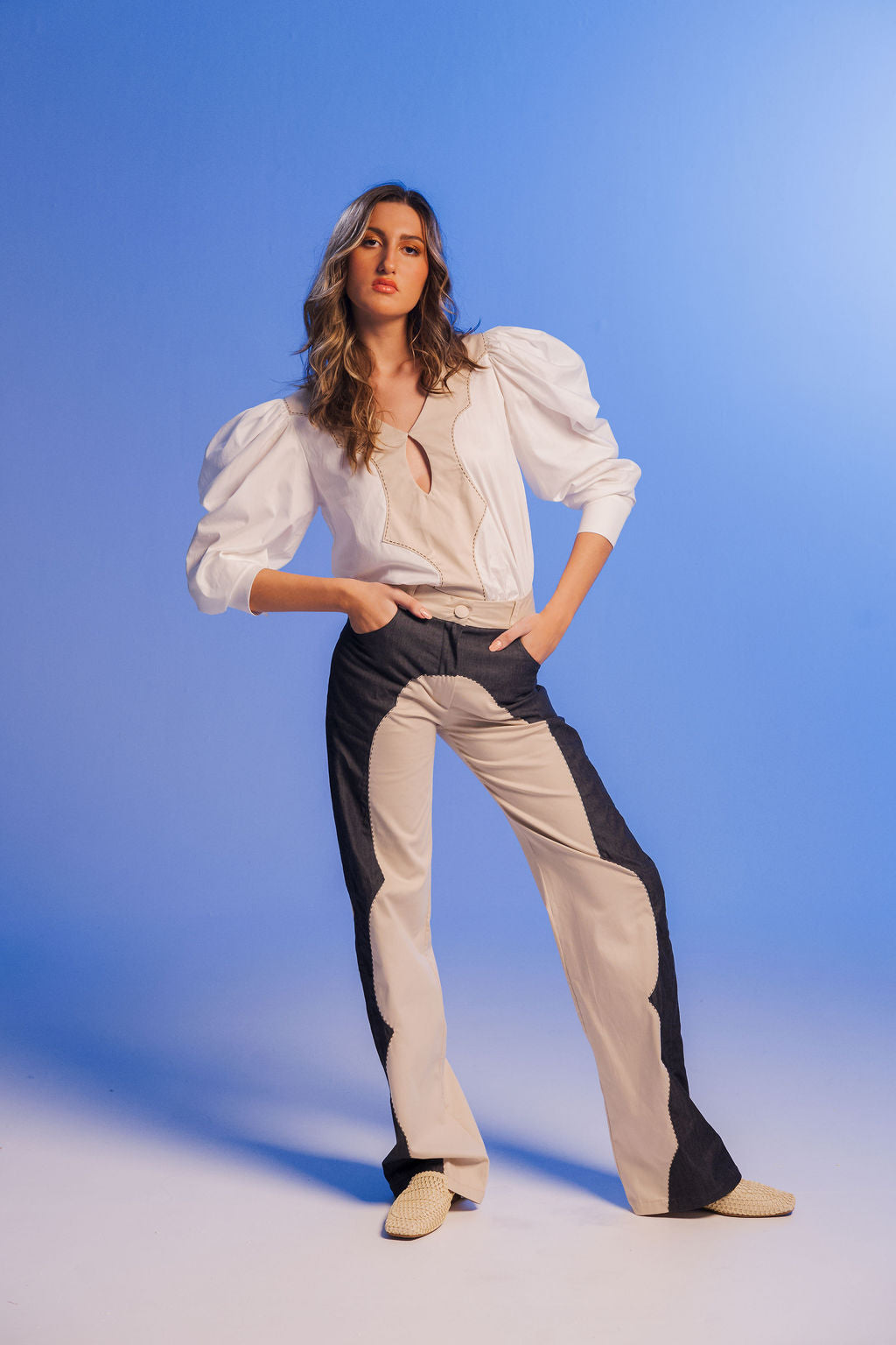 100% cotton poplin shirt with gathered puff sleeves, structured two-tone bib, and teardrop front keyhole detail. Contrast hand stitching enhances the tailored finish.