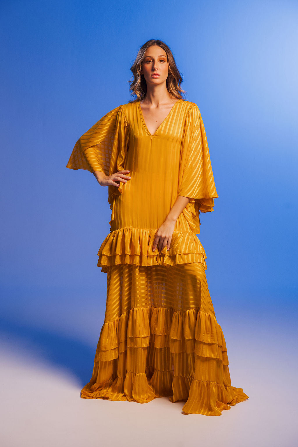 Designed for women who embrace elegance with freedom, this mustard maxi dress features a fluid silhouette, wide sleeves, and layered ruffles. Made from a semi-sheer, striped satin-textured fabric, it evokes effortless femininity and bohemian sophistication. Ideal for resort events, beachside celebrations, or sunset dinners, it reflects the soul of Latin American high fashion; crafted with meaning, beauty, and intention.