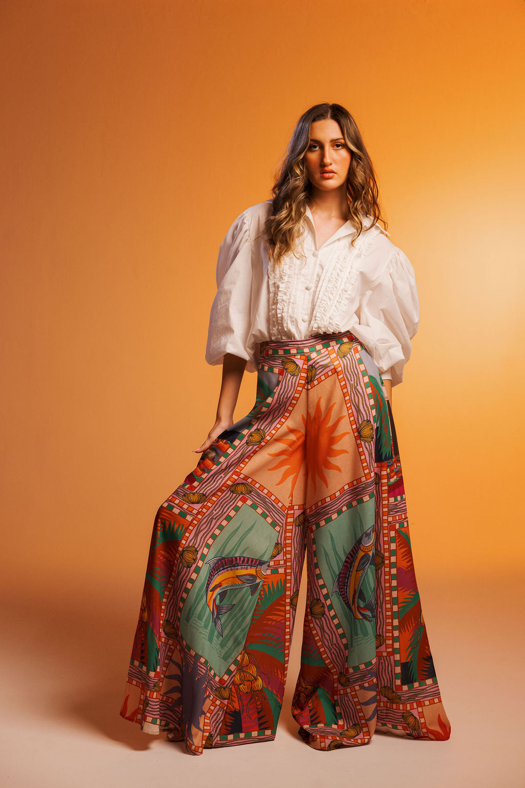 Wide-leg pants with a tropical print inspired by the iconography of the Panamanian Caribbean. Its flowing silhouette and cinched waist make it a standout piece, perfect to pair with neutral tops or romantic blouses.