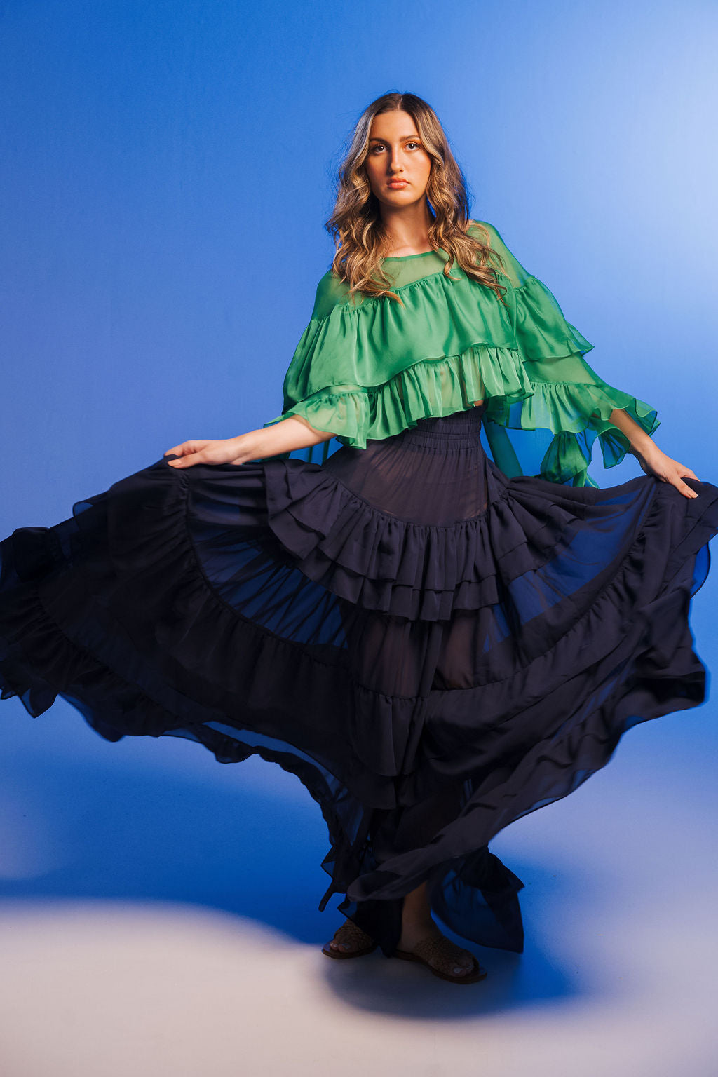 Long chiffon skirt with layered ruffles and a fluid silhouette. Its romantic and airy design makes it perfect for seaside strolls or dancing at sunset.